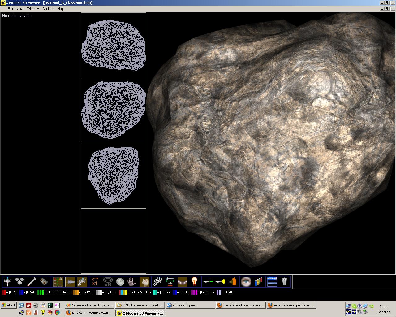 Yep, the asteroids I made also use specular and tangent normal maps, and so will all future models I make, they are essential technologies nowadays. Note that those in-game screenshots look like they might be using (tangent space) normal maps over old fashioned gray scale bump mapping. This allows finer detail with fewer shading artifacts; a big improvement.They use two additional textures. Specular level texture for lighting control and bump mapping texture to show craters (this one not visible in upper screenshots). Here is their ingame shot http://www.egosoft.com/games/x3/screens ... en_195.jpg . Also a cool one http://www.egosoft.com/games/x3/screens ... en_098.jpg showing similar craters on each asteroid because of shared texture.